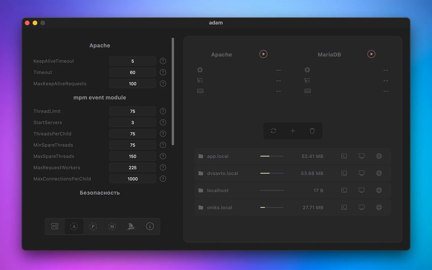 Built from scratch, without Homebrew, Docker, or external dependencies, Adam gives you a full LAMP stack (Apache, PHP, Mariadb) with fine-tuning and a graphical management interface – right out of the box.