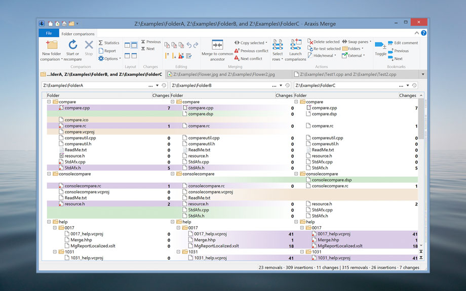• Merge supports folder hierarchy comparison and synchronization, enabling you to compare and merge entire directory trees. This is ideal for detecting changes in different versions of source code or web pages. You can even use the efficient byte-by-byte comparison option to verify the contents of recordable CDs or USB thumbsticks.