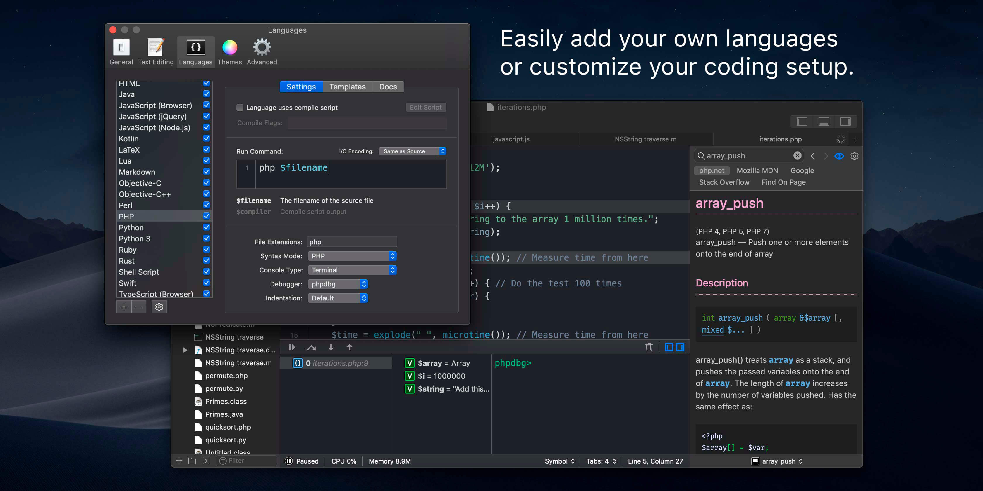 CodeRunner was built on the principle that you should be able to run your code instantly in any language. CodeRunner can run code in 23 languages out-of-the-box, and can be easily extended to support any other language. Adding a language is as easy as entering its terminal command.