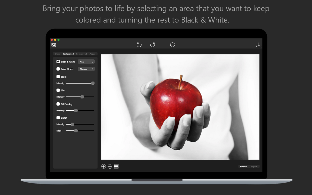 Do you want to apply a focus blur effect to your photo? Just select the area of the photo that you want to keep into focus and blur the background for a depth of field effect. Combine artistic filters like Black and White, Sepia, Oil Painting or Sketch to make your photos stand out.