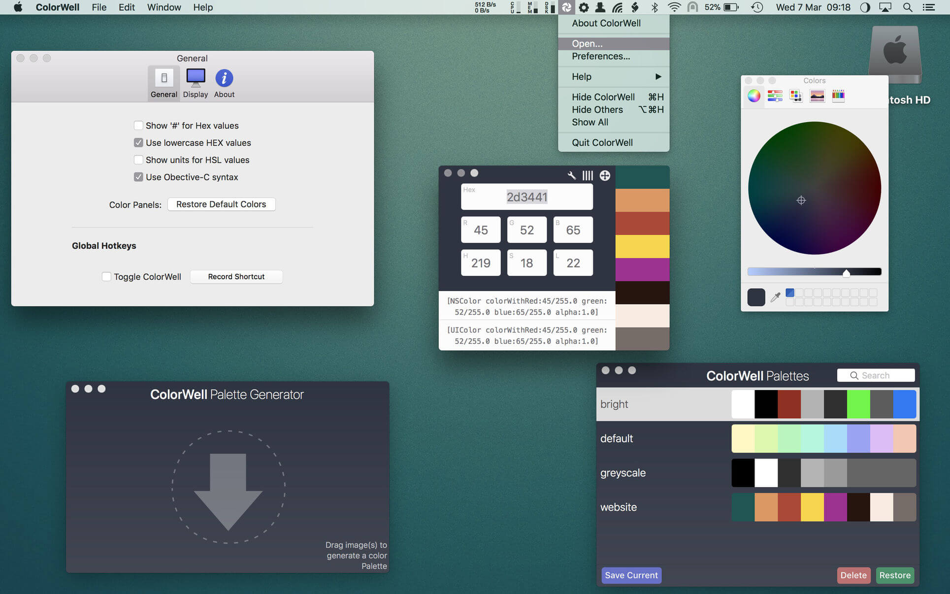 Access to the MacOS Color Wheel can be tedious by default, but ColorWell can be configured to show it via global hotkey or a quick mouse click from your system menu bar. This allows you to quickly grab Hex/HSL/RGB and code snippets from any color source.