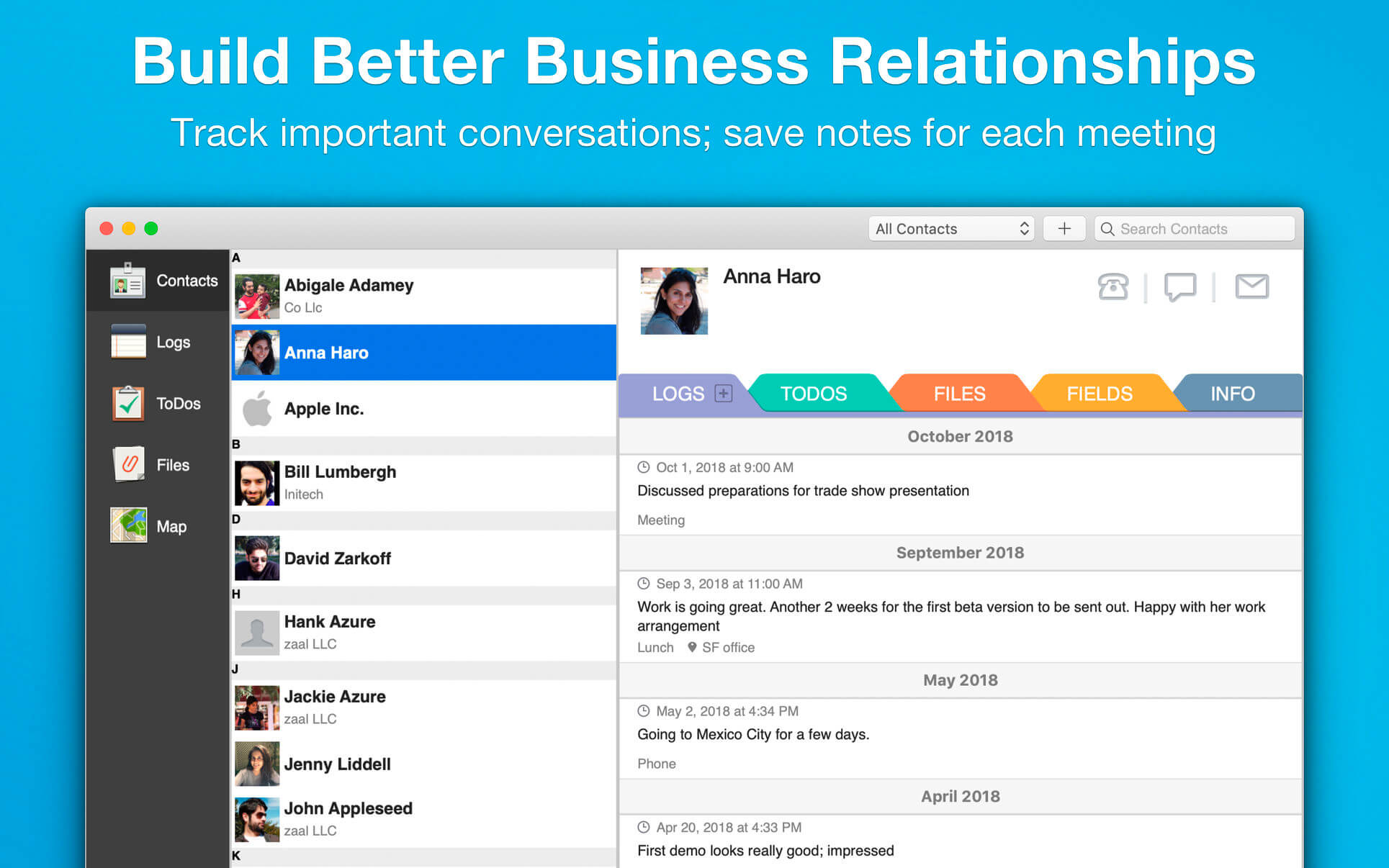 Contacts Journal is a powerful tool that will transform your business and personal relationships: save notes of important meetings, set follow ups and meetings, create custom contact fields, and attach important documents to each of your contacts. Available on the Mac, iPhone and iPad, with seamless iCloud syncing across all devices.