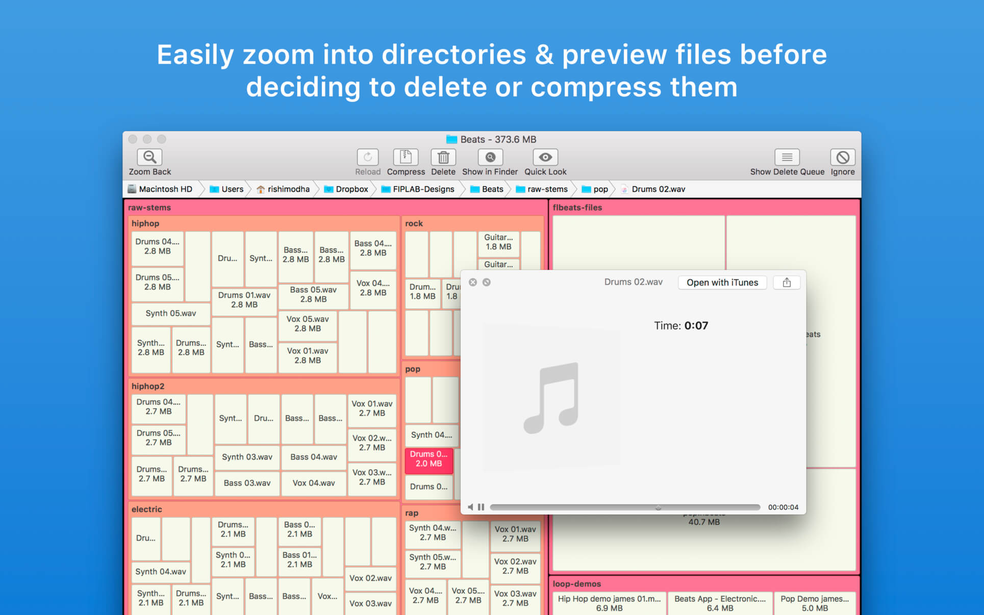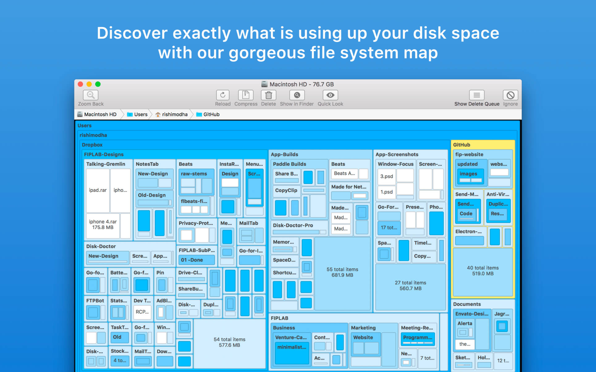The app quickly scans your drives to build a stunning treemap visual display of files and folders on your computer, allowing you to easily navigate through your file system and find out what is taking up the most space.