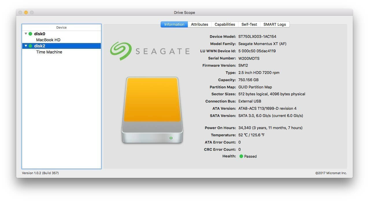 Hard drives (and solid state drives) are the most failure prone components in your Mac. For that very reason, in fact, drive manufacturers have built in self monitoring, analysis and reporting technology right into the drive. (a.k.a. SMART) Most utilities barely scratch the surface of this information, simply reporting the bare essentials: pass or fail. Too often, once the overall failure has occurred, there isn’t enough time to get important data from the drive. With Drive Scope you can see into the health of most any drive connected to your Mac.