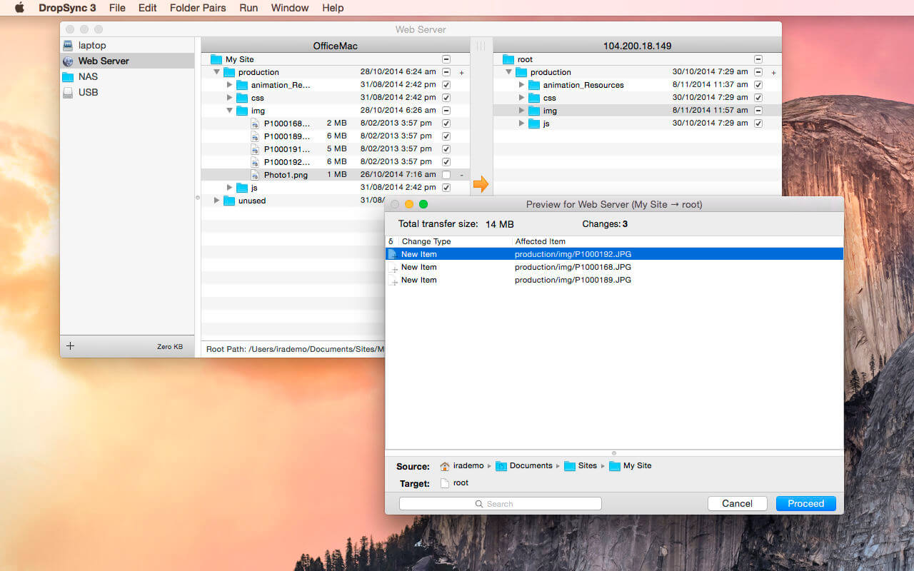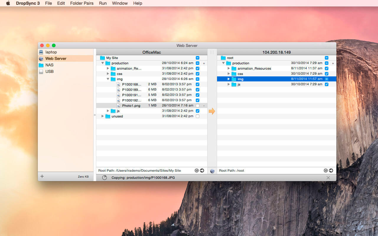 Setup a pair of folders and easily browse both sides even if one folder is on a remote server (via sftp). Then select items for include/exclude and click to perform an update in the desired direction. Previews show you exactly what will be changed and once you’re satisfied that things are working, you can setup DropSync to automatically watch a source folder and update in the background.