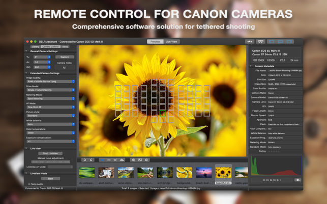 - Control practically all camera parameters, key settings and shooting functions remotely. With only a few clicks you may change aperture, shutter speed, ISO, image size and quality, control lens focus and more. While it is still possible to set all options in the camera, it often makes more sense to make the changes remotely.