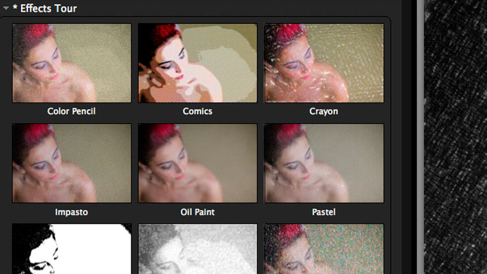 Quickly start by choosing from hundreds of new styles and ten natural media, such as oil paint, watercolor, and pencil sketch. Then customize anything from brush size to paint thickness to make your signature look. Snap Art’s wide range of control lets you make your work completely unique.