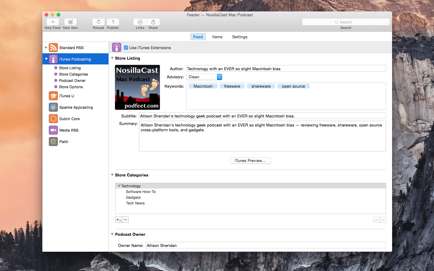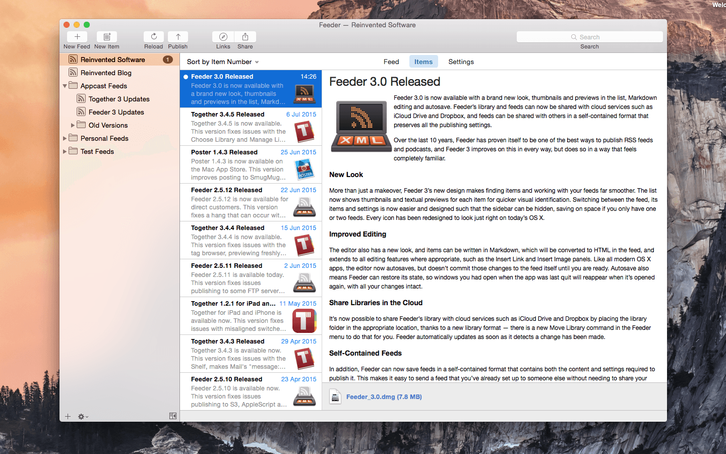 Feeder is a full-featured application for creating, editing, and publishing RSS and iTunes podcast feeds. Features include quick and easy feed editing with auto-complete, templates, HTML tags, Markdown, an HTML preview and more.