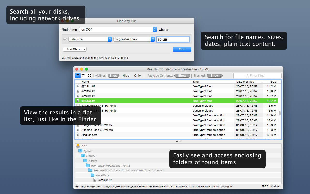 Unlike Spotlight (i.e., the Finder’s Find command), it does not access a pre-built database but searches the chosen volume directly. This allows you to find any file, even those inside packages and others excluded from Spotlight search. Hence it is great for finding system files, for example.
