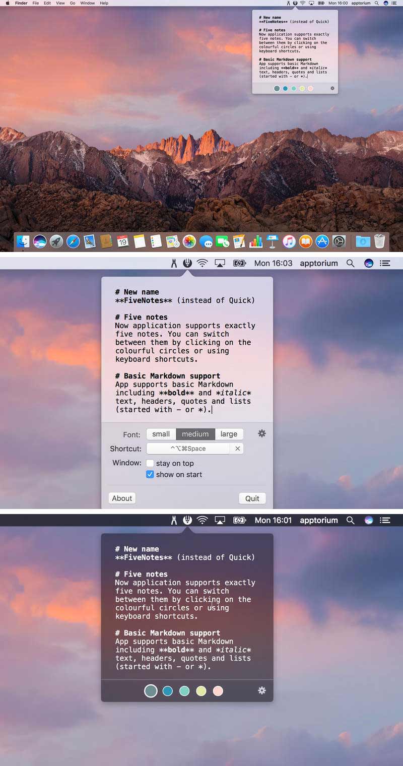 Five notes with one click. Anytime. FiveNotes (formerly known as Quick) is a small text editor that you can always access by clicking (or pressing shortcut keys) on its Status bar icon. Even if you’re working on a full screen app. If you prefer, it can stay on top of the window, so it can be used as a cheat-sheet app. FiveNotes offers exactly 5 notes that can be switched using colourful circles under the text area or by pressing shortcut (cmd+shift+[ and cmd+shift+] or cmd+number of note).