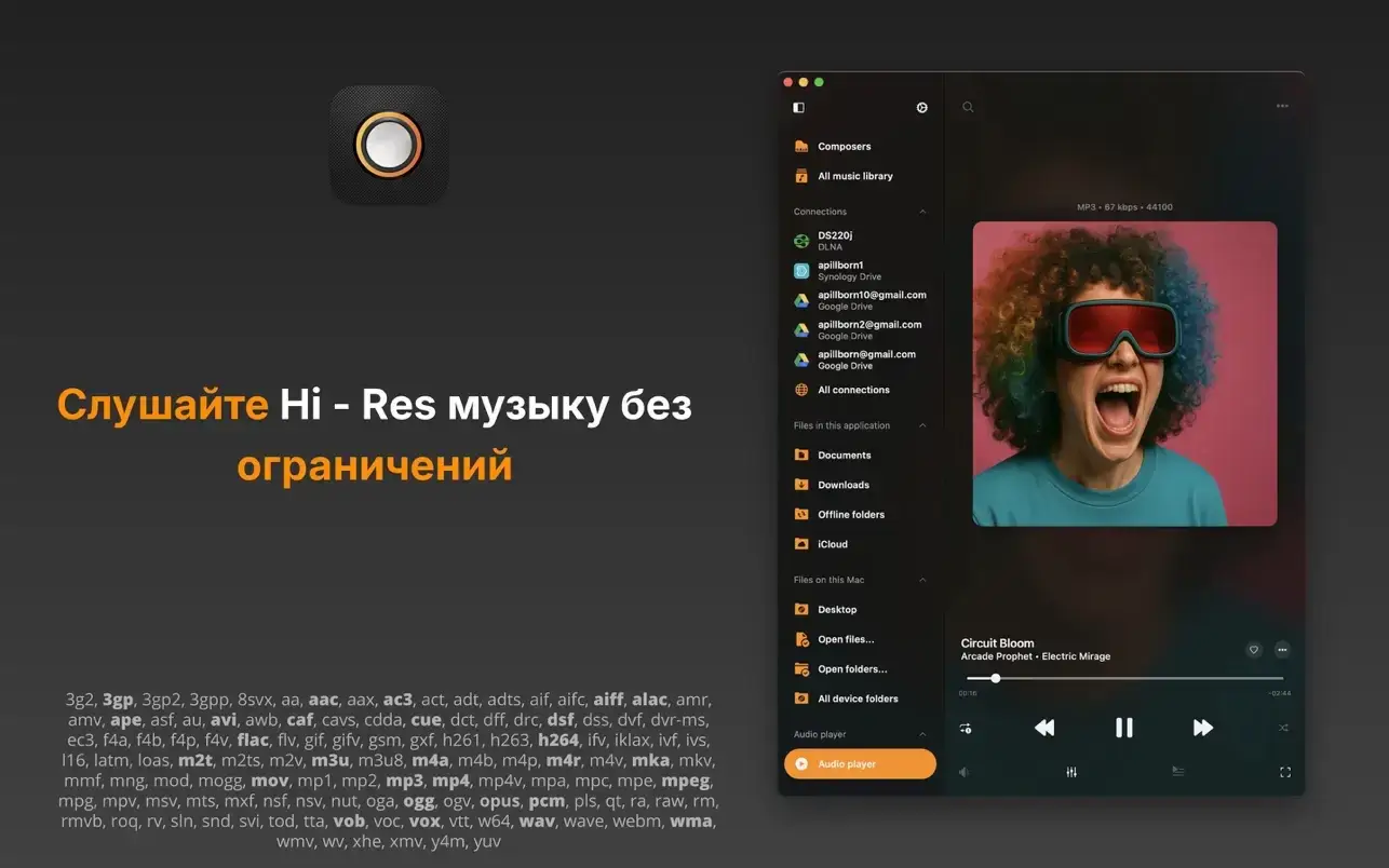 Open almost any audio file on your device and enjoy lossless sound quality. Free up space by moving your music to personal NAS storage or cloud services, and then stream or download your favorite songs for offline playback. Sync your music library automatically, with all audio files grouped by categories. Create custom playlists, change song order, and manage your music collection with the built-in file manager. The built-in audio equalizer includes presets for popular genres, manual controls, preset import and export, and a preamplifier for louder sound. Quickly find your favorite albums and songs with the smart search feature.