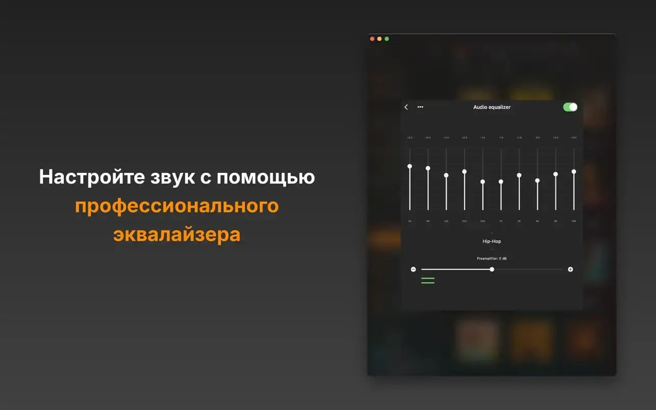 • • Audio Equalizer: custom presets, level indicators, preamplifier.