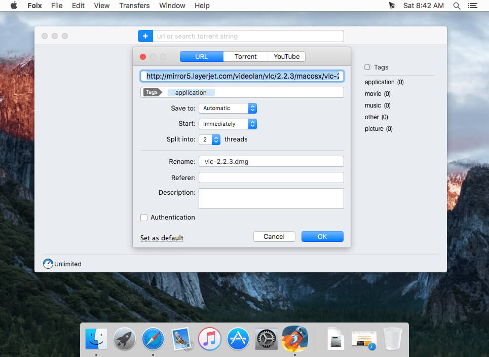 Folx makes downloading extremely easy: just open the page with the file to be downloaded, click the link in your browser and Folx will start the download for you. The application splits the file being downloaded in up to ten threads, thus significantly increasing the download speed. Its auto resume option comes handy when the downloading gets interrupted. You can also assign a tag or a few to the downloaded content for accurate and easy search through the downloaded files. You can optimize traffic allocation between different applications by regulating manually the download and upload speed.