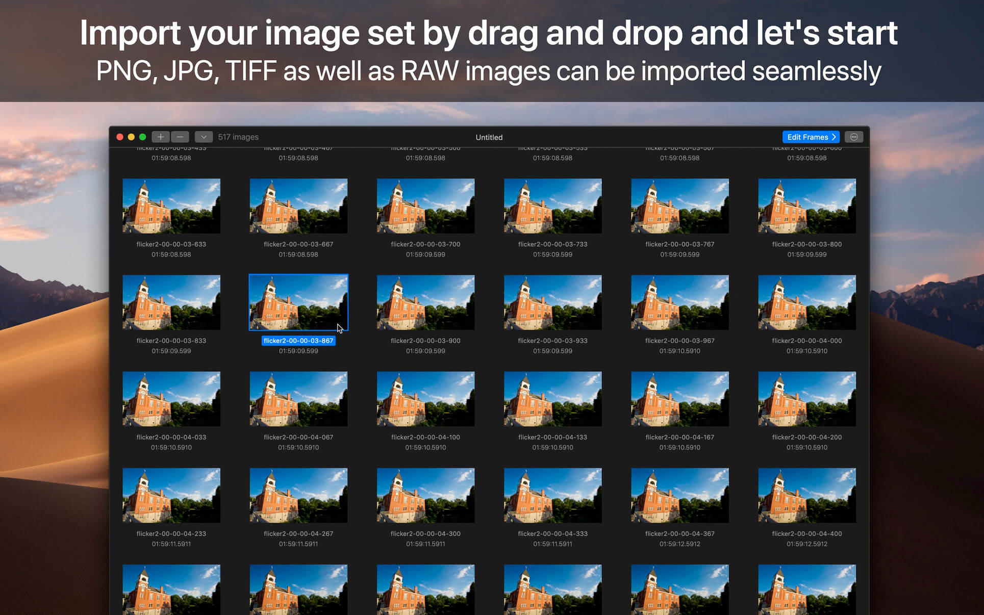 The application is designed for professional needs. That is why it can handle several hundreds of thousands of images painlessly. In addition, all industry-standard formats are supported. The application can import PNG, JPEG as well as all RAW image formats supported by macOS. The exported movie can be encoded in H.264, Apple ProRes as well as HEVC.