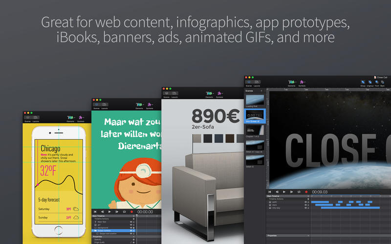 Hype is used by leading designers to create animations which add a “wow” factor to web pages, infographics, presentations, digital magazines, ads, iBooks, educational content, app prototypes, portfolios, animated GIFs, videos, entire websites, and much more. Hype won the 2011 Macworld Editors’ Choice Award.