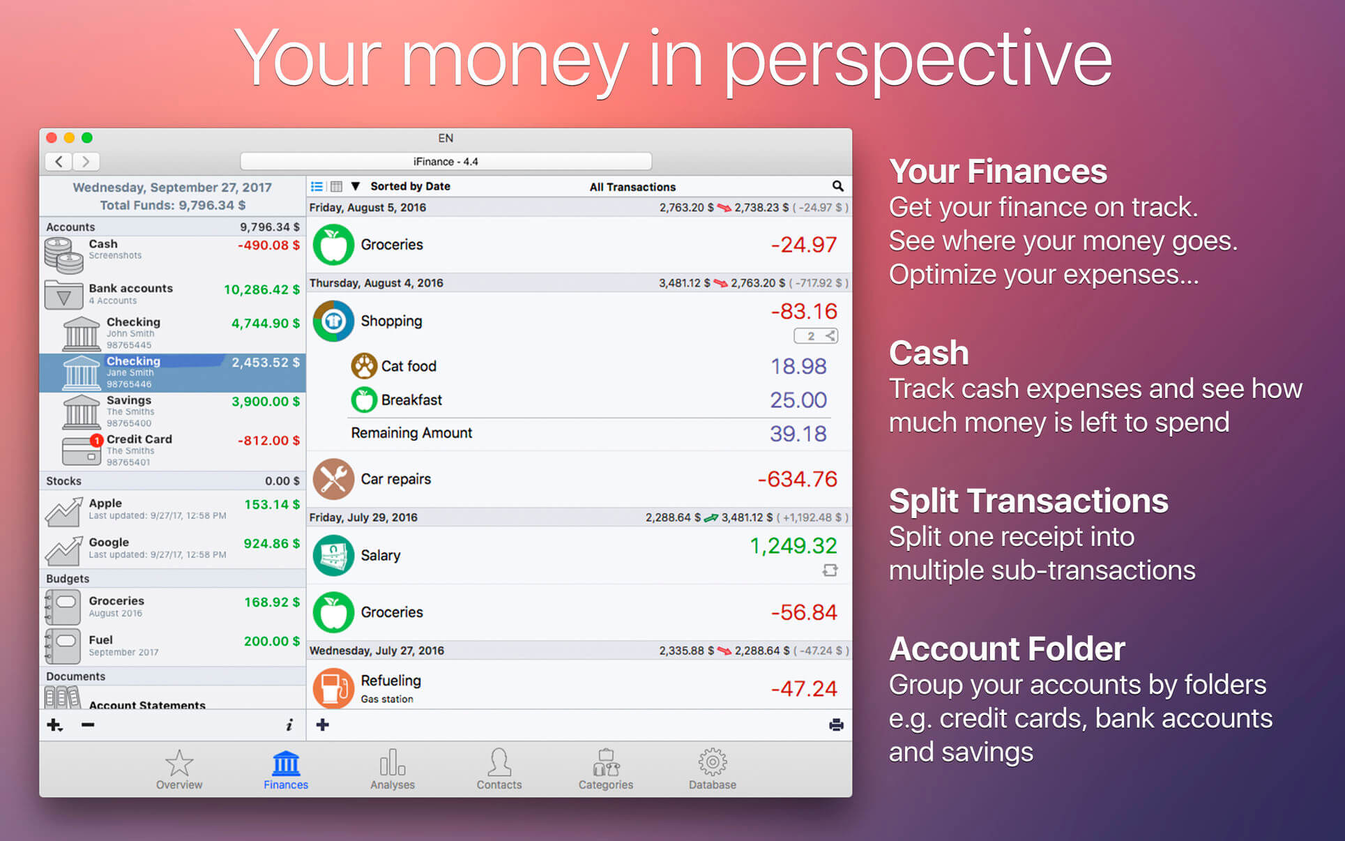 iFinance allows you to keep track of your income and spending — from your lunchbreak coffee to your new car — in the most convenient and fastest way. Clearly arranged transaction lists of all your financial resources from your debit account to your credit card and cash show you exactly what you spend your money on – the first and most crucial step in getting your finances on-track. iFinance lets you know how your assets perform. Have it analyze your finances and the available charts and reports will show you instantly what your biggest spending items are and where there’s potential for savings. The convenient budget feature helps you review your financial goals. How much money can you spend today if you want to stay within your budget? How much more income is needed to achieve your monthly goal?