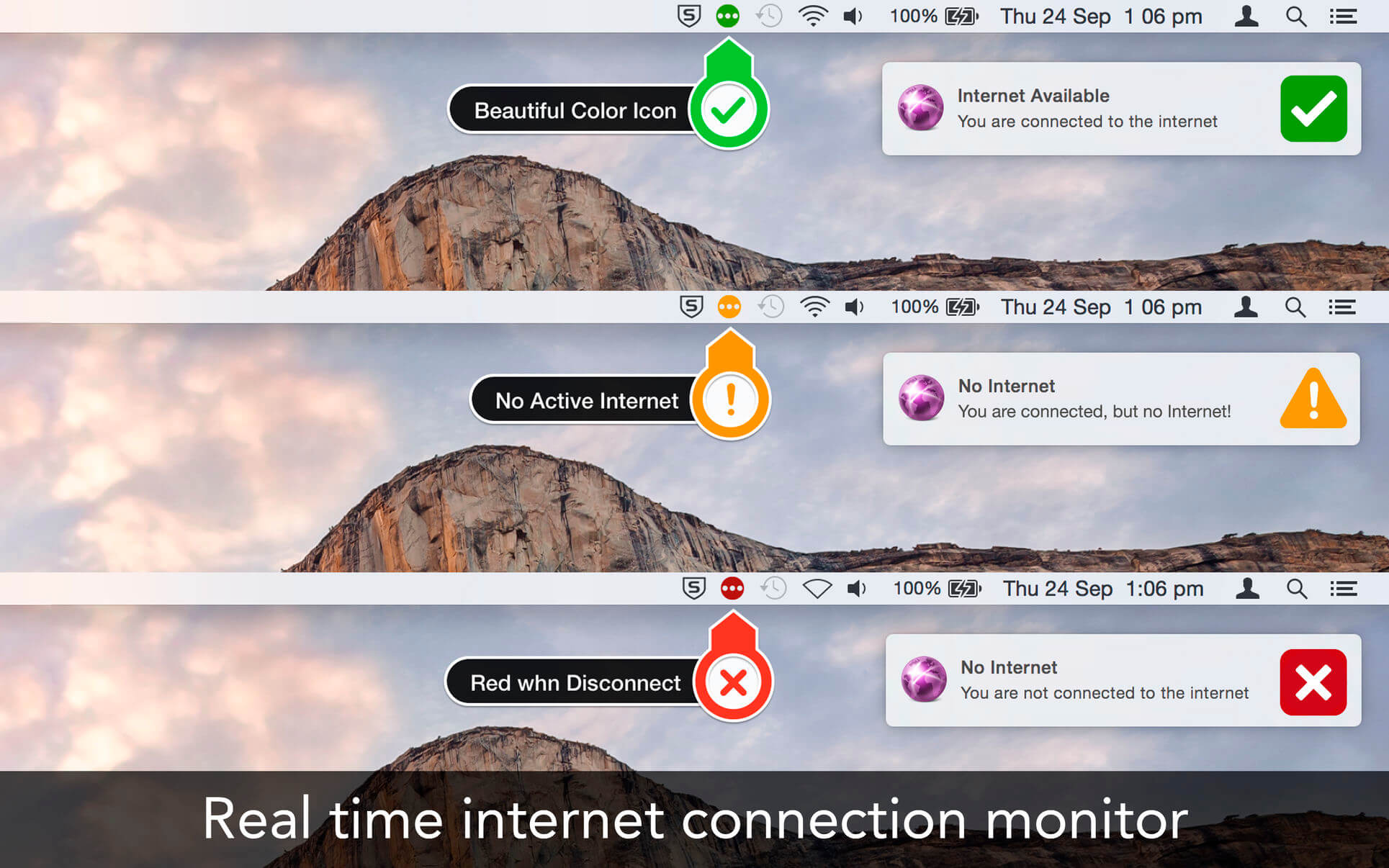 Internet Status keeps you informed about your Internet/network connection right from the menu bar. Its icon indicates the status of the connection and opens to display other stats, such as your IP address, upload and download speed, etc.