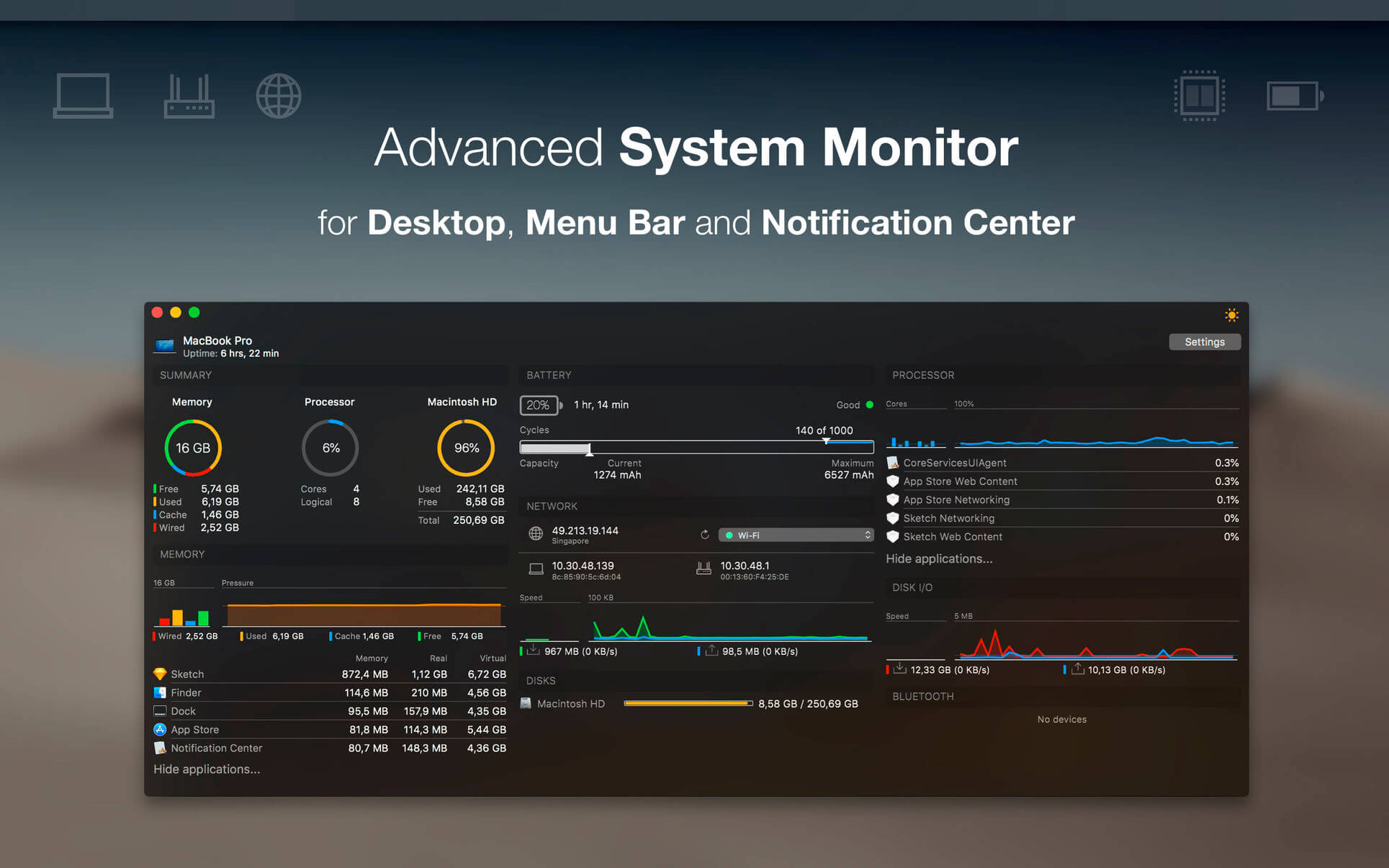 iStatistica is an advanced system monitor for macOS. It includes notification center widget and status bar menu. Simply slide out notification center to keep an eye on your CPU, memory, disk usage and network activity.