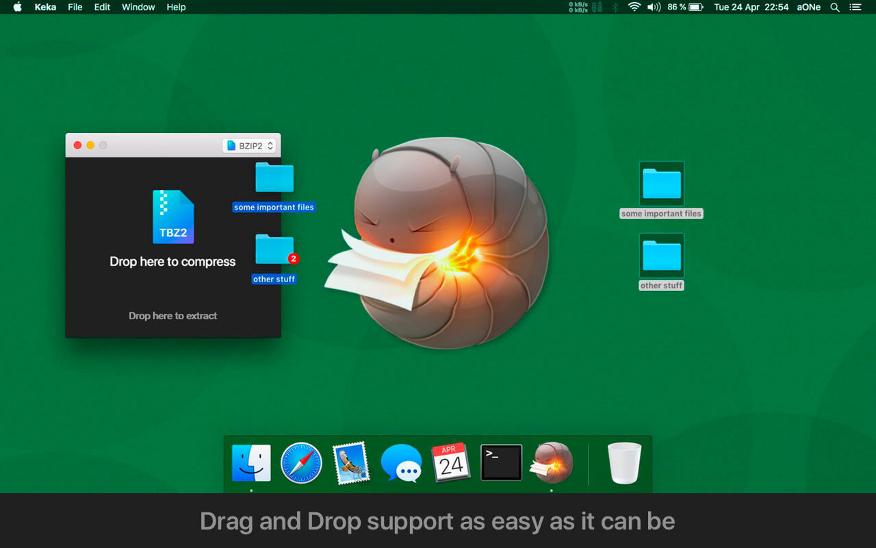 With Keka you can compress as many files as you want in a bunch of formats. Divide files and protect them with a password is now a kids game. Just drop the files you want to compress to the Keka icon in the Dock or the main window.