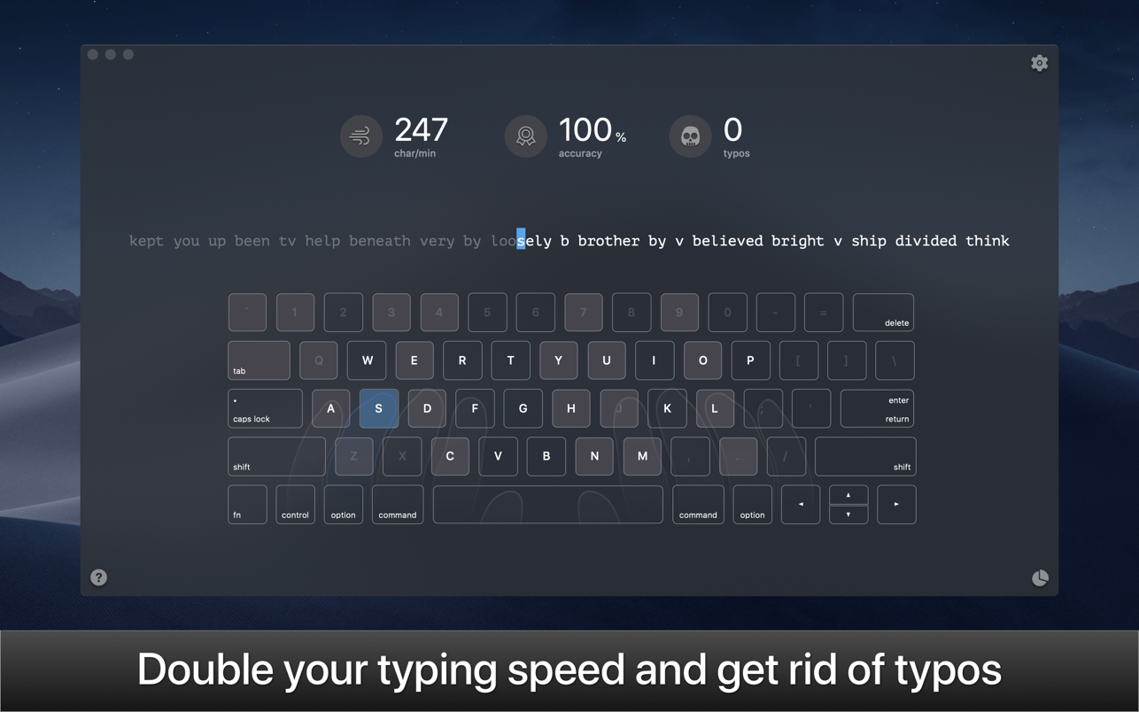 KeyKey is a manageable typing tutor that learns your level as you practice. All you do is commit to a 15-minute session every day. The app takes care of the rest. There are no lessons, no tests, and no strange minigames. Instead, you get a beautiful minimalist interface and a boost to your WPM. The app records your errors and adapts the practice wordlist as you go, giving you extra practice for the letter combinations that trip you up.