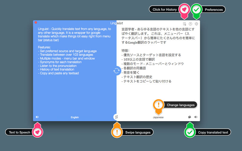 Linguist is easy to use translation tool for quick translation from the menu bar (status bar) or window. Translation of words or phrases by selecting in any other app or website with just a click or command (HOTKEY). It can translate document in .txt, .rtf and .doc formats.