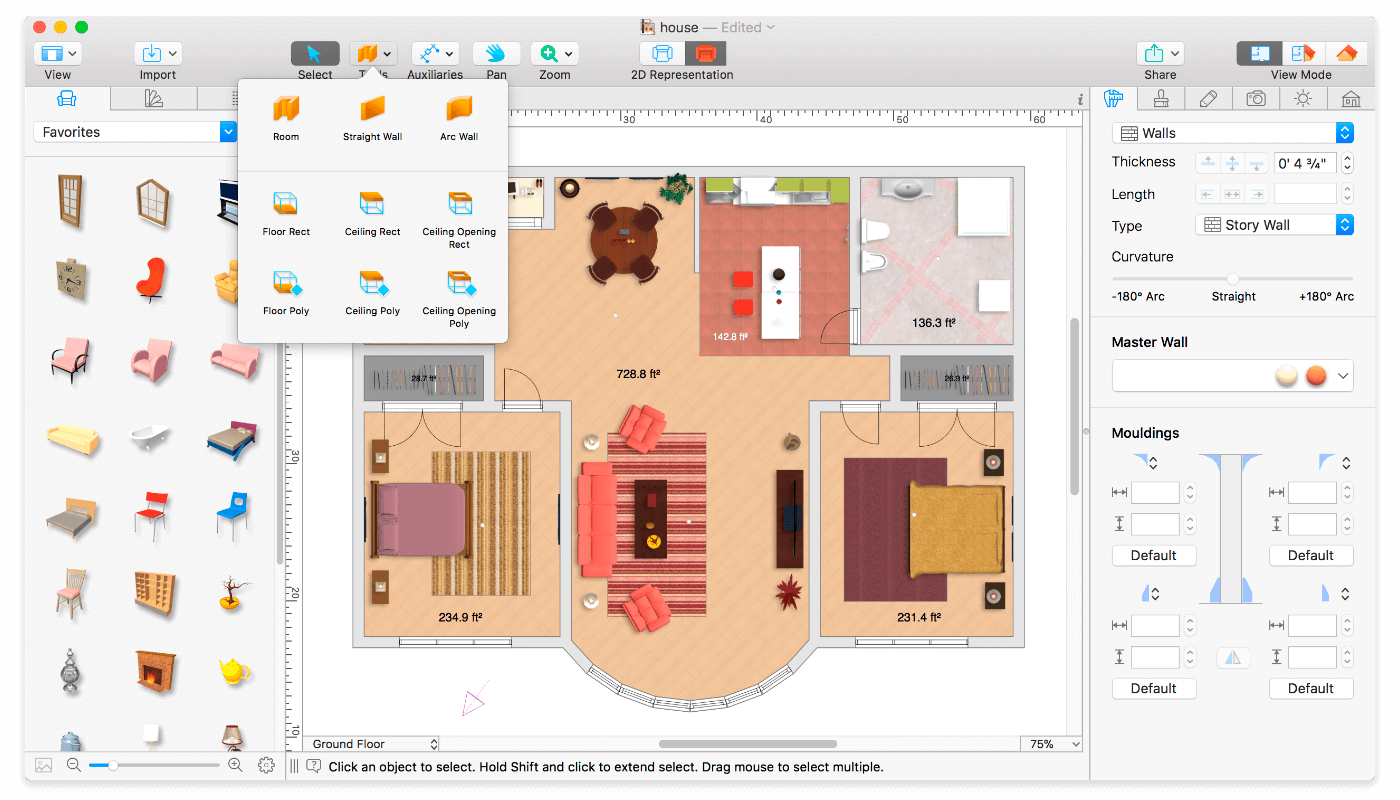 • Use Arc and Straight Wall tools for drawing walls.