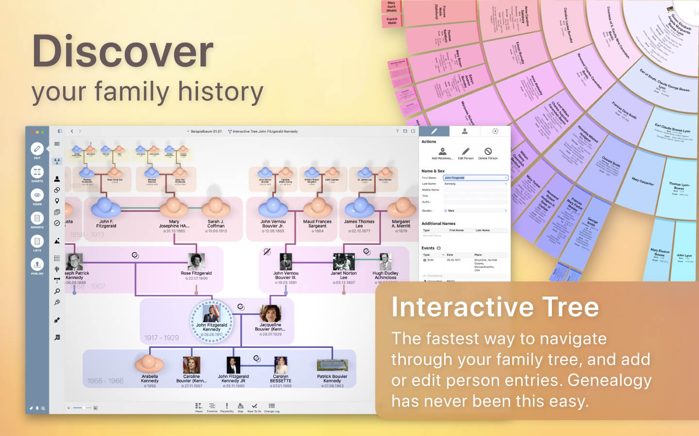 - Show your family tree: charts, reports, views, and lists