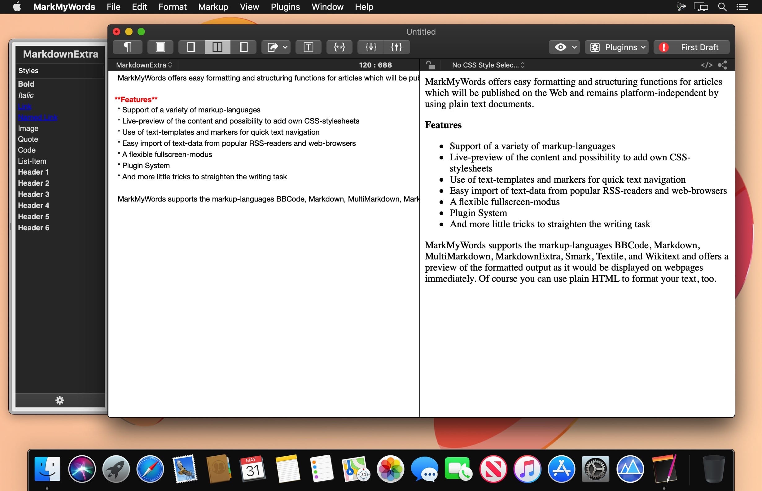 MarkMyWords supports the markup-languages BBCode, Markdown, MultiMarkdown, MarkdownExtra, Smark, Textile, and Wikitext and offers a preview of the formatted output as it would be displayed on webpages immediately. Of course you can use plain HTML to format your text, too.