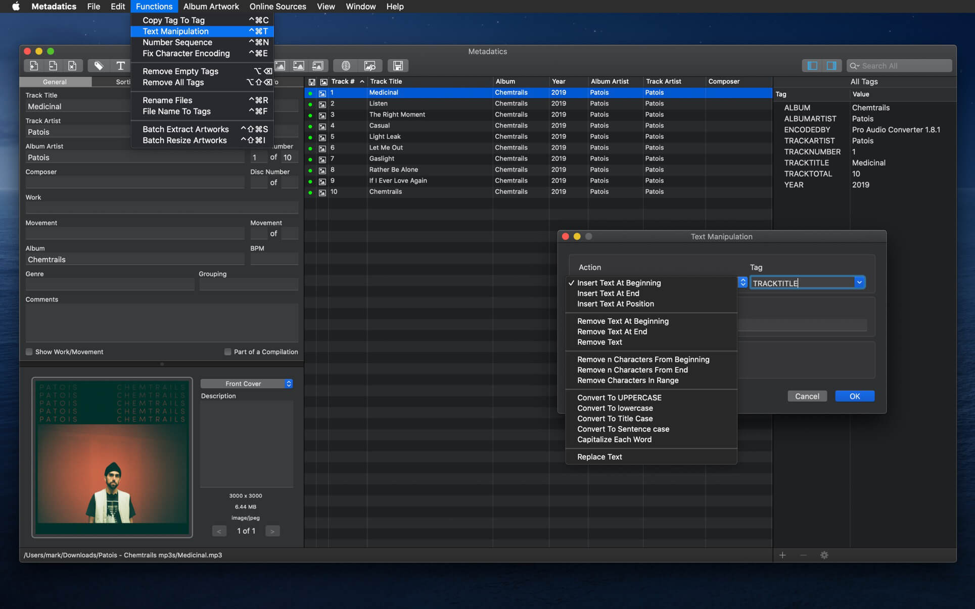 - Functions – Metadatics has a number of built in function to quickly manipulate data. Replace text, remove characters from the beginning or end of a tag, generate number sequences, copy from tag-to-tag, and much more!
