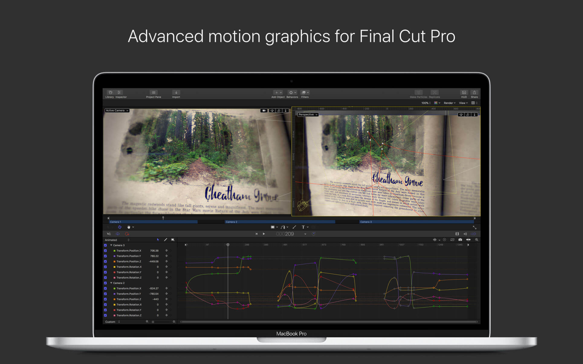 Designed for video editors, Motion is a powerful motion graphics tool that makes it easy to create cinematic 2D and 3D titles, fluid transitions, and realistic effects in real time.