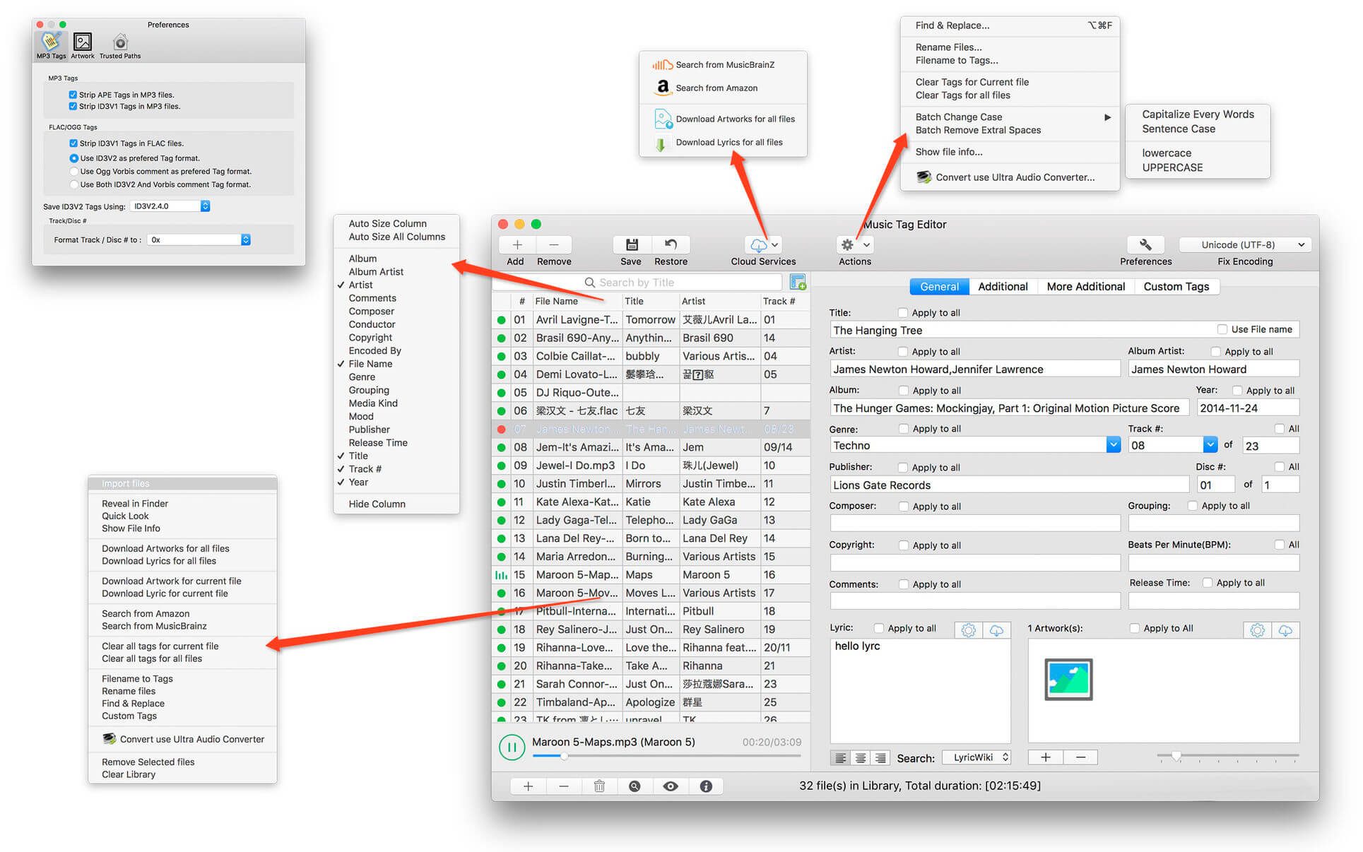 - support id3v1,id3v2,xiphComments, RIFF Info, APE Tag, Ogg Tags,iTunes tags. Tags:Title,Artist,Album,Genre,Copyright,Comments,Artworks,Lyrics and so on…