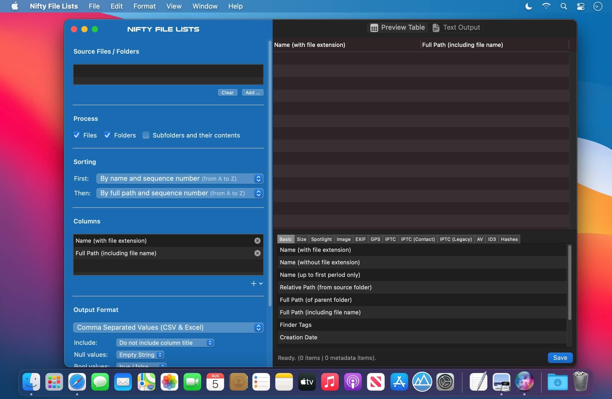 As well as the table-based preview, Nifty File Lists also fully previews the actual file output, so that can you precisely fine-tune the output before committing it to disk.