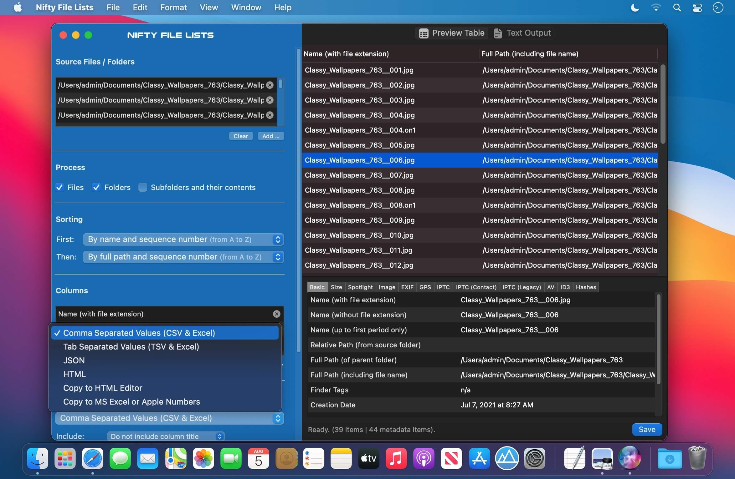 Nifty File Lists allows you to save file lists in MS Excel, Numbers & Pages-friendly CSV (Comma-Separated Values), TSV (Tab-Separated Values) and even HTML formats.