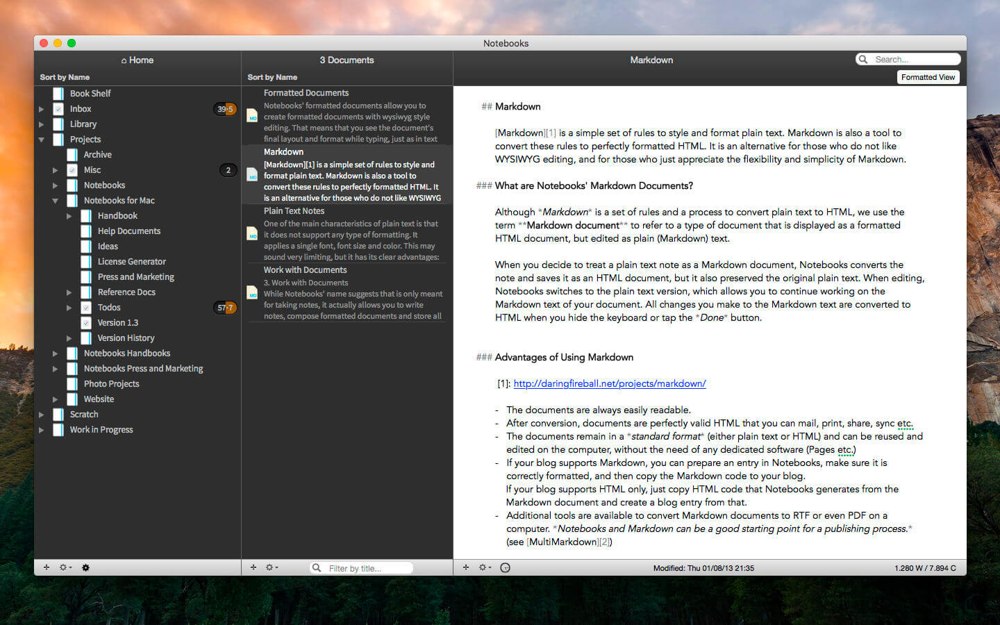 Notebooks stores all your documents as regular files on your computer’s hard drive, so you can always access them through Finder to open and edit with other applications, too.