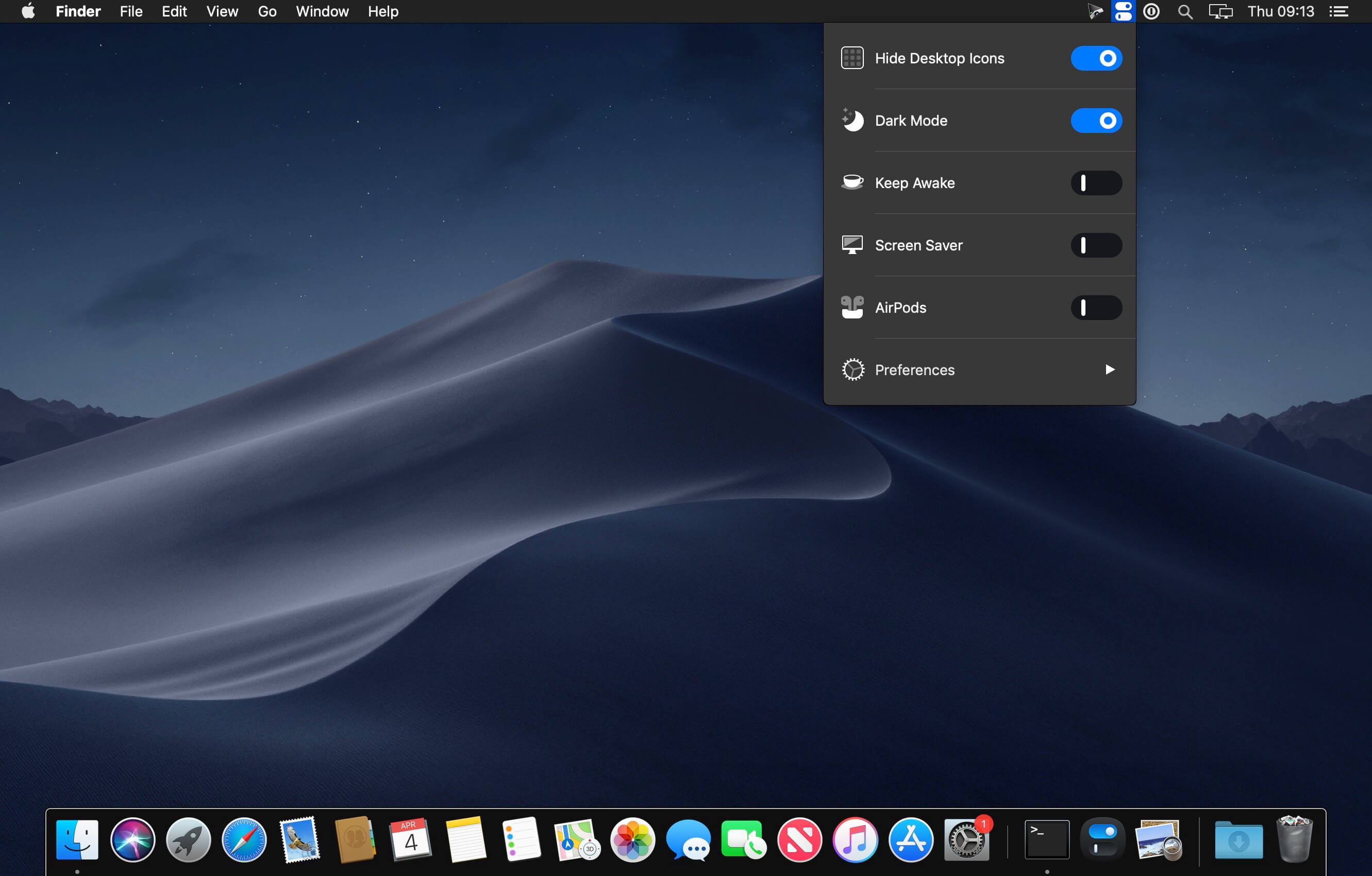 One Switch is a tiny app designed to improve your efficiency by providing quick access to a few important switches. It can be opened from your menu bar, and it allows you to toggle certain system features with just a couple of clicks.