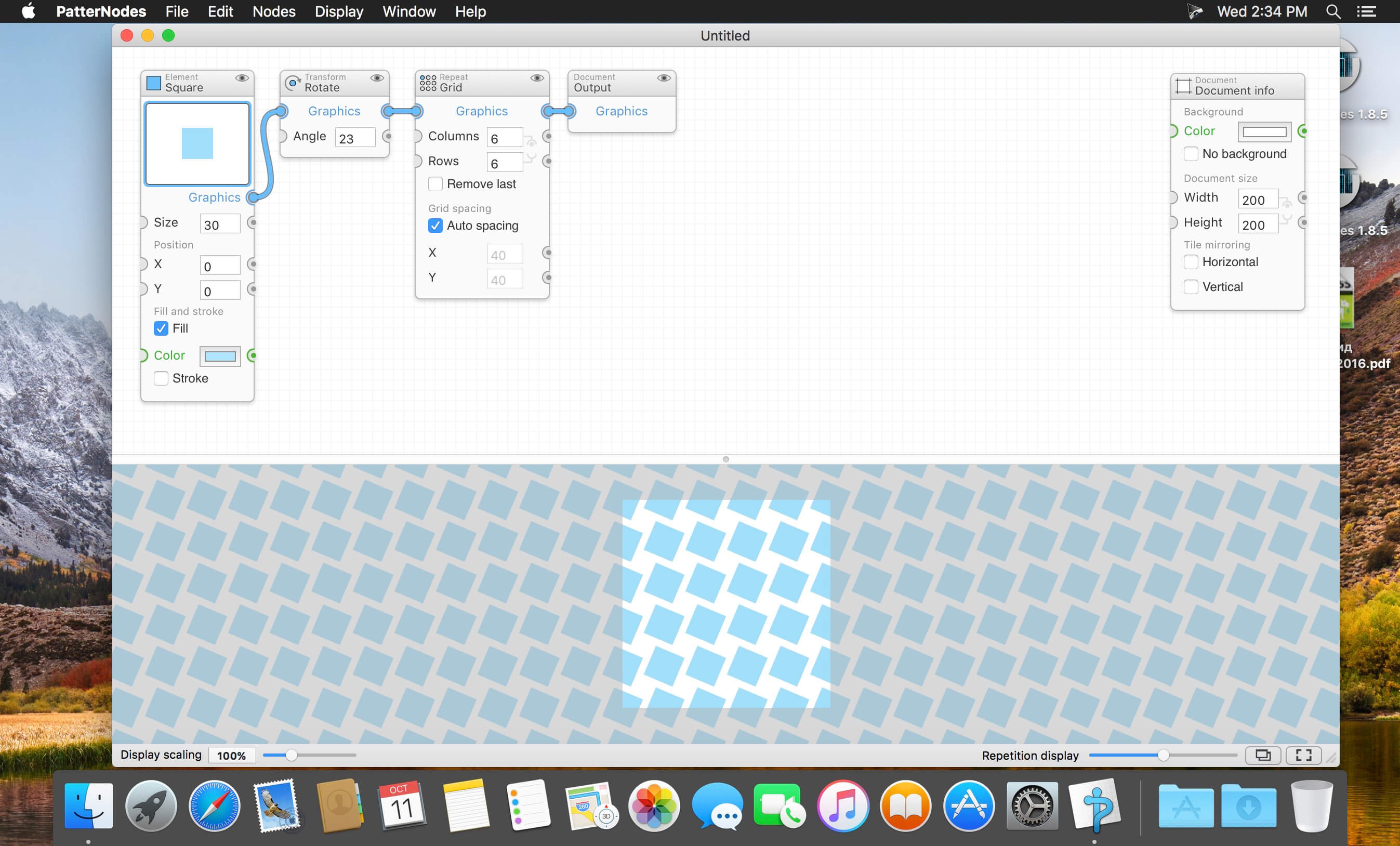 The resulting pattern tile is always shown in the bottom preview view, repeated and updating in real time with any changes, giving you instant feedback of what the end result will be. To make pattern creation easier PatterNodes also includes a lot of nodes that automatically perform common tedious tasks like repeating elements at the tile edges to make the pattern seamless, or randomizing different aspects (like color, position, rotation, etc.) of the elements in a pattern to give it a little more life. Finally, when you’re done you can simply copy the pattern tile into whatever illustration or graphics application you use, or export it either as vector graphics or a bitmap image file. Animations can be exported as GIF, QuickTime MOV or numbered PNG or JPG files