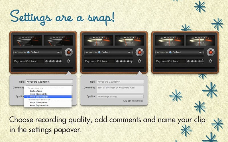 Record From Apps and Devices Select an application or audio device in Piezo, then just hit Record to save the audio! Easy Podcast Recording Piezo records from Skype and other VoIP apps with ease. It even saves the audio to distinct channels for easy editing. Settings Are a Snap Open the settings popover to choose your recording quality, name your clip, and add comments. Piezo’s Features and Uses Grab From Any App Piezo captures audio from just about any application playing on your Mac. Super Simple Recording With one click, recording audio on your Mac has never been simpler. Recording, Demystified Piezo’s simple recording presets mean less worrying about your settings. Here’s Looking at You Simple and striking, Piezo’s charming interface makes recording fun. Record Web Audio Save audio from the web, just by setting a browser such as Safari or Chrome as your source. Archive Skype Calls Piezo records from Skype in a single click. It couldn’t be simpler! Save Streaming Music Record from services like Spotify, Rdio, MOG, and more. Record Audio Devices Hook up any microphone (even your Apple headset) and record from it instantly. Get Sound Bites Record from movies playing in any video player, including QuickTime Player, VLC, and many more.