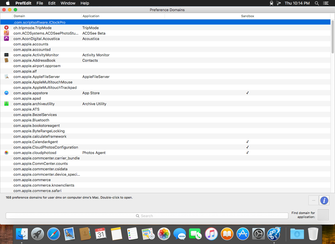 PrefEdit is a utility that allows you to inspect and edit all preference settings for OS X applications. The settings are displayed in a browser and can be edited by simple point-and-click operations. You can also do a full-text search on all settings, or clean up unused entries of applications that have been uninstalled.