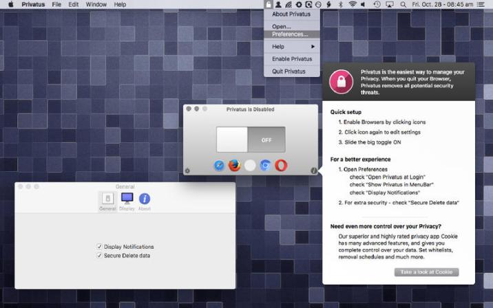 Privatus supports all the major Mac OS X browsers: Safari, Firefox, Chrome, Chromium, and Opera.