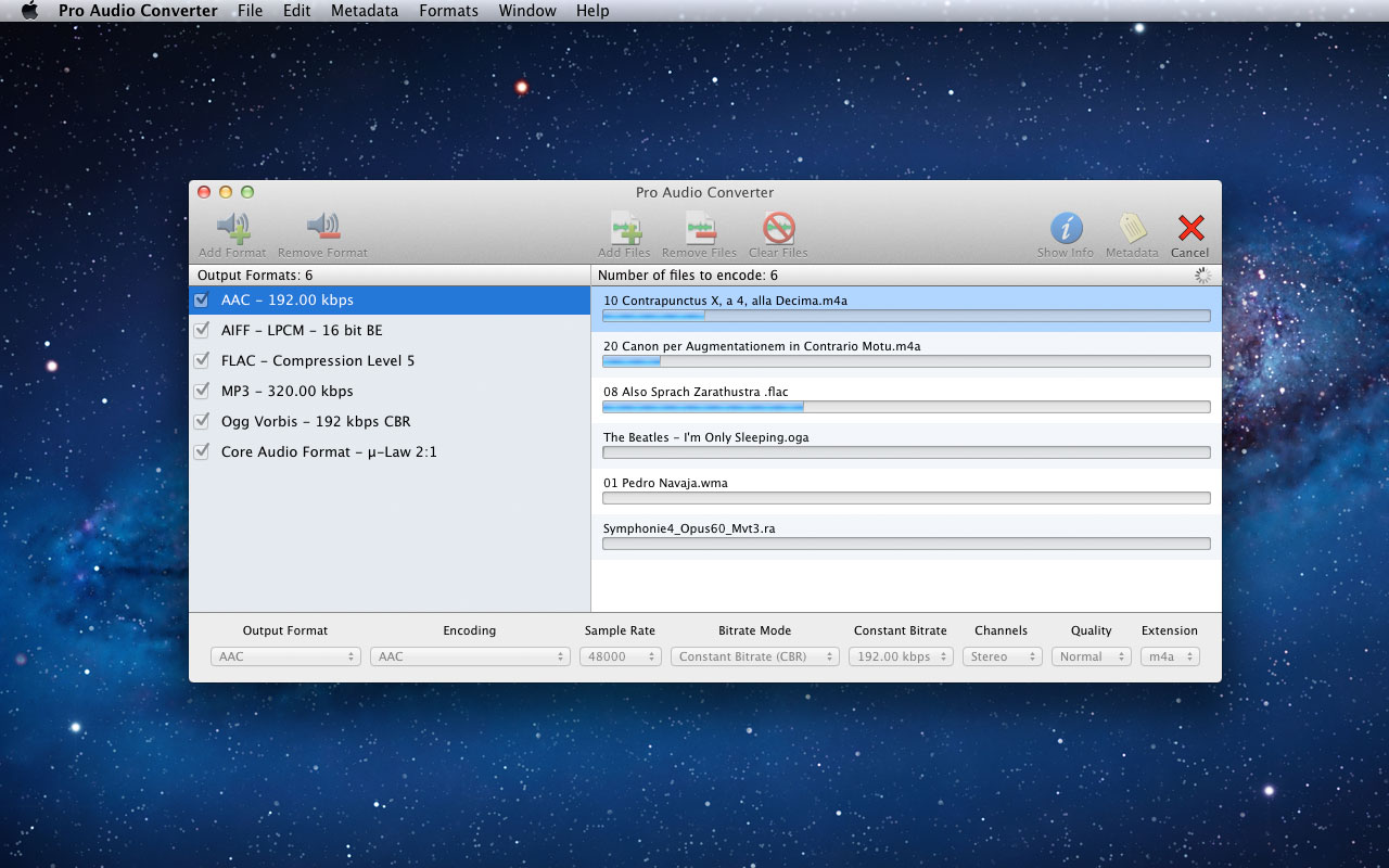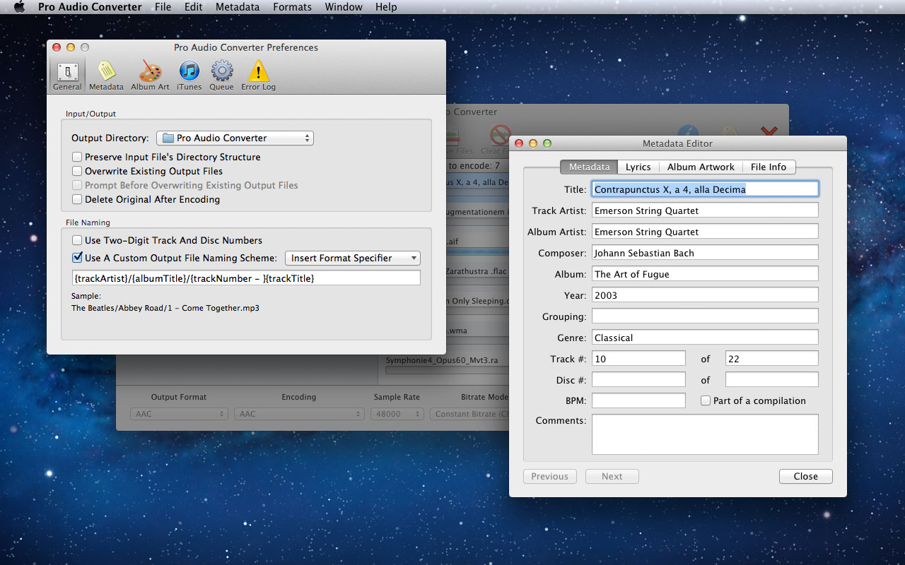 Pro Audio Converter is an application for converting between a variety of audio file formats. It is multi-threaded and will batch convert multiple files at once to multiple formats at once. It supports reading and writing metadata and can create custom output file paths based on the metadata. It can also edit the metadata of existing audio files without the need to re-encode, functioning as a basic tag editor. Pro Audio Converter also gives you the option to add your converted files to iTunes.