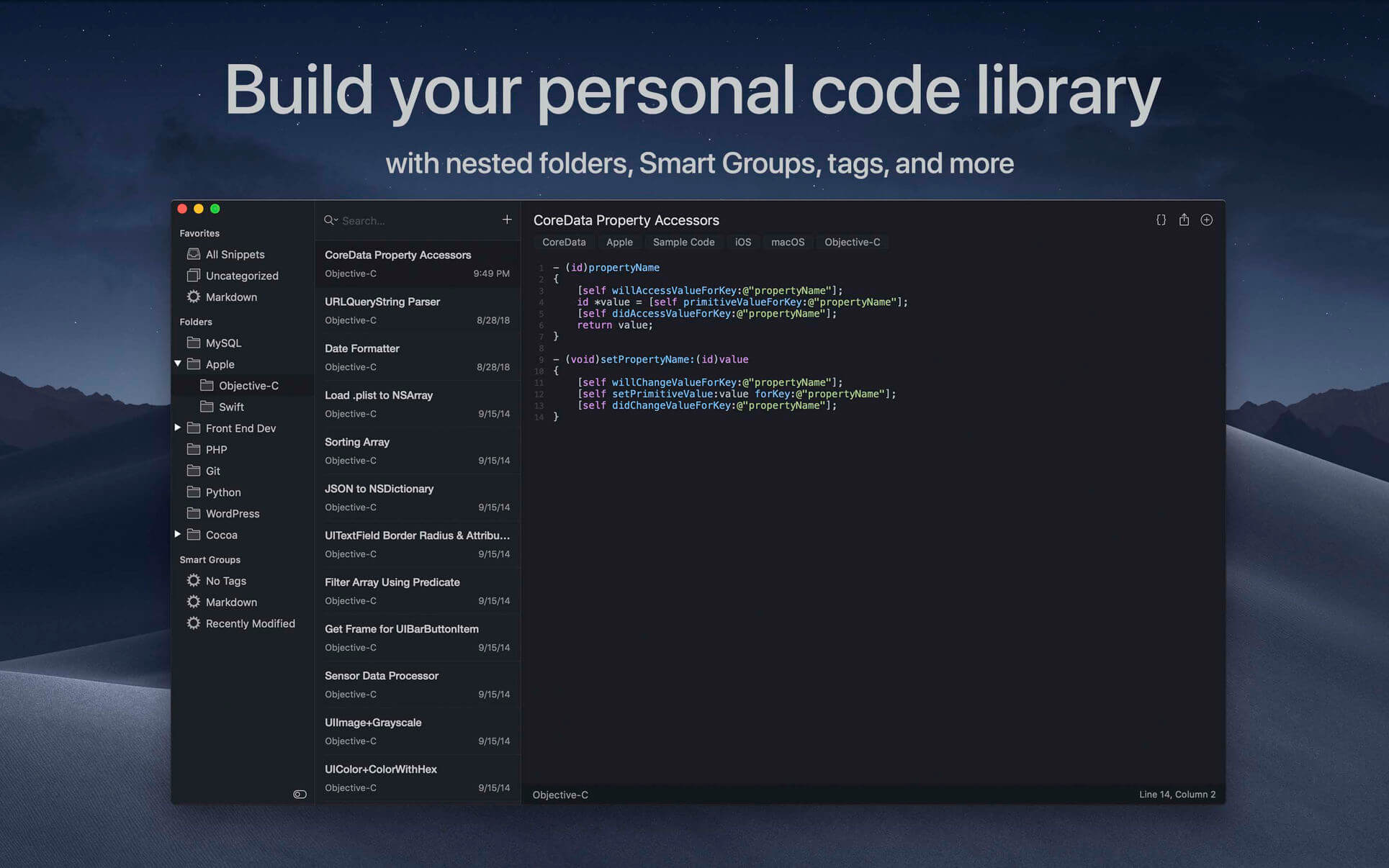 SnippetsLab is an easy-to-use snippets management tool. It helps you to collect and organize valuable code snippets, and makes sure that you have easy access to them whenever you want.