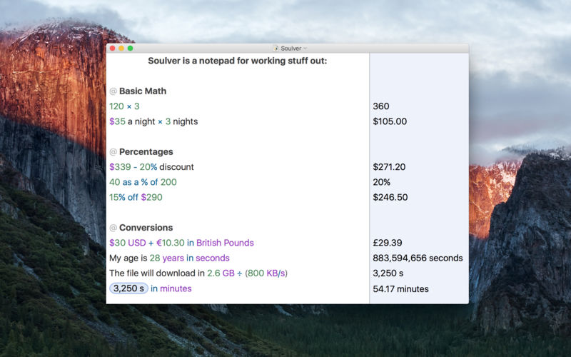 Soulver 3 is a smart notepad with a built-in calculator. It gives instant answers to any calculations it finds in your text. It’s a better way to work stuff out than with a traditional calculator, and a more lightweight tool for quick calculations than a spreadsheet.