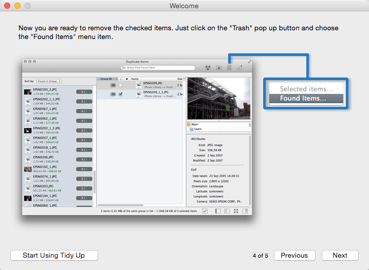 - With Tidy Up you can search for duplicate files and packages by the owner application, content, type, creator, extension, time modified, time created, name, label, visibility, and date/age. You can also search by the tag, duration, and bit installments of MP3 and AAC sound files and EXIF metadata; search the contents of the Photos, iPhoto, Aperture, iTunes, iPod databases, and Mail mailboxes; and synchronize deletions with iPhoto, Mail, and iTunes.