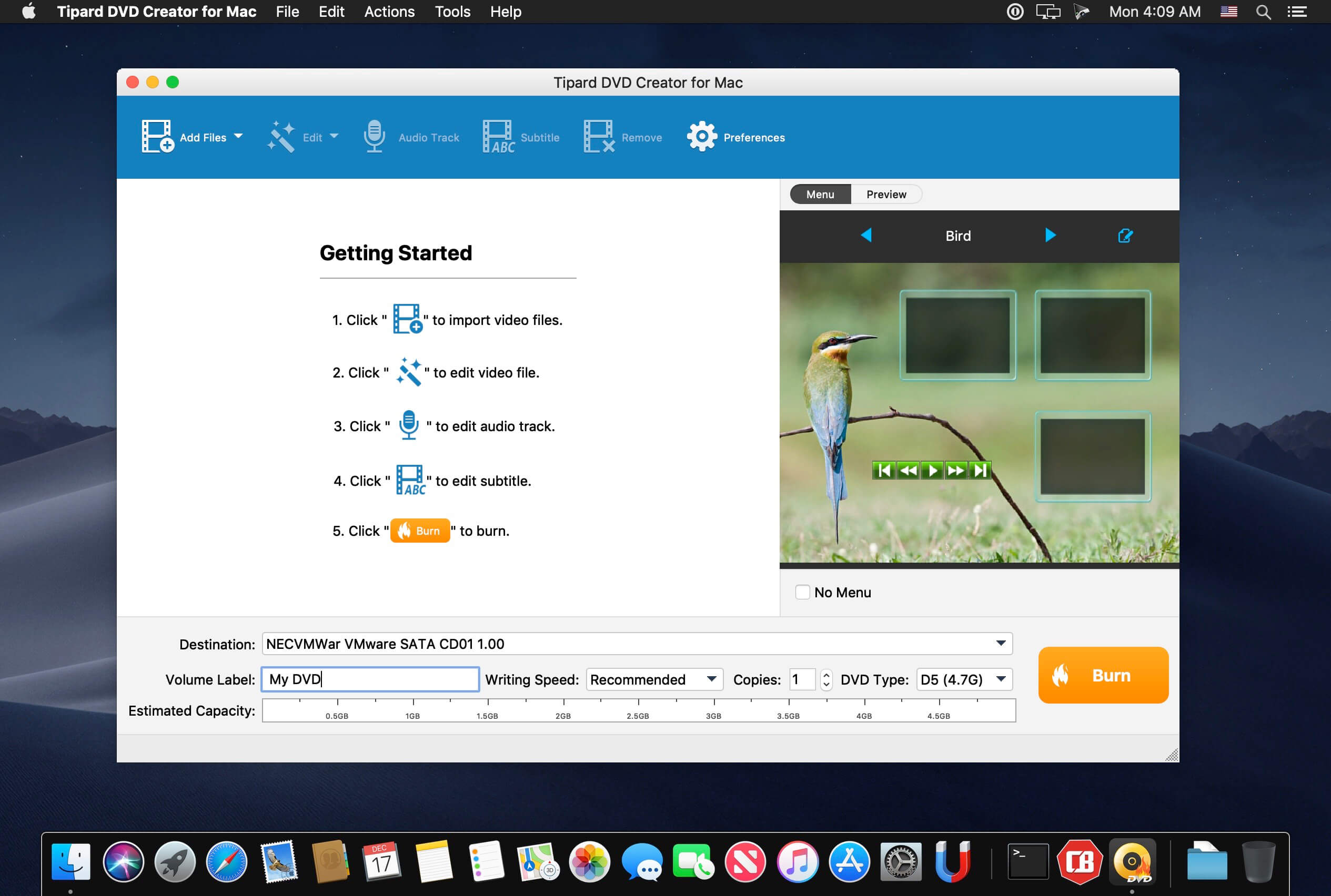 Tipard DVD Creator for Mac lets you burn any videos like MP4, AVI, WMV, MOV, MKV to DVD on Mac at ultra-fast speed. Tipard DVD Creator for Mac is a professional DVD authoring, burning and copying tool that helps you convert video in any format like MKV, AVI and MP4 to DVD without watermark. Now you can create your personalized DVD disc/folder/ISO files from favorite videos!