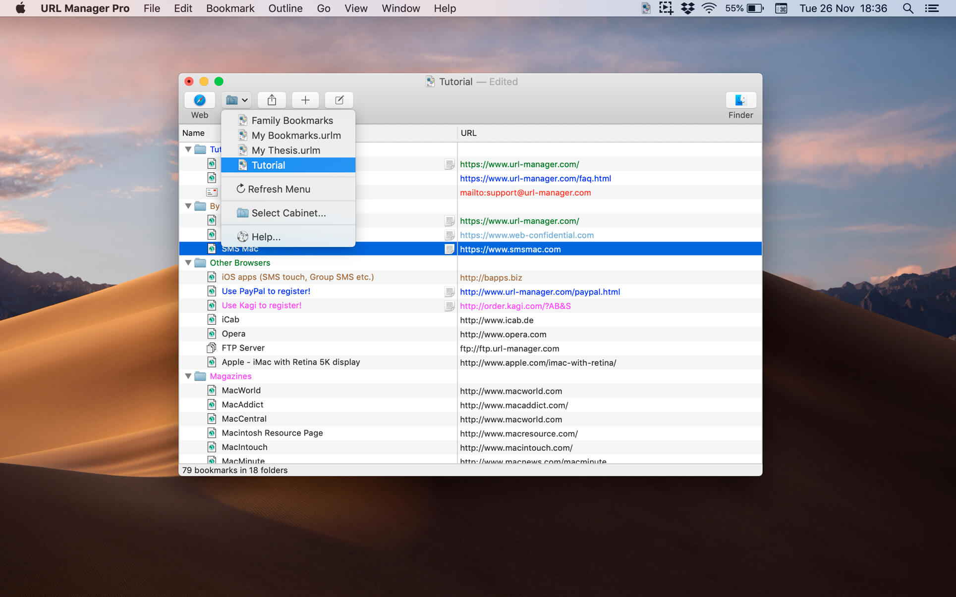 In the URL Manager Pro documents, you can manage your bookmarks easily with drag and drop. You can add tags, notes and colours to your bookmarks.