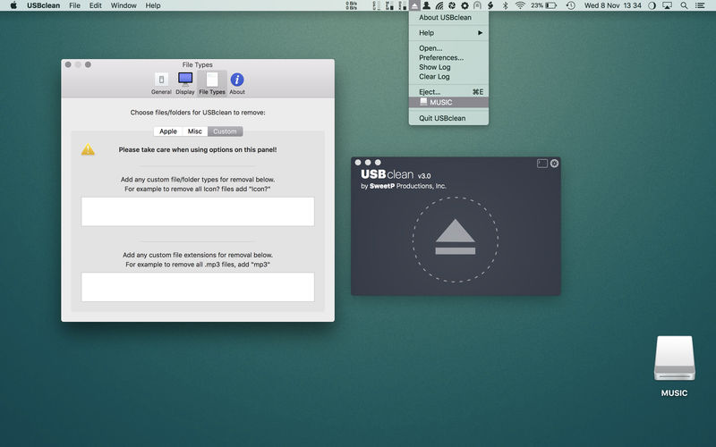 USBclean quickly and easily removes all those pesky junk and ghost files from your external Windows formatted USB drives. .DS_Store, Thumbs.db, .Spotlight, and trashes files take up precious space, and can cause issues on some devices. Remove them all quickly and easily with USBclean. Configure USBclean the way you want! Remove files by dragging your drive into the handy drop zone, from the system menubar, or by dropping straight onto the dock icon. You can easily configure USBclean to run only from the system menubar and open at login. It’s a snap to auto quit after dropping your drive onto the dock icon. USBclean always ejects your drive after cleaning for your convenience.