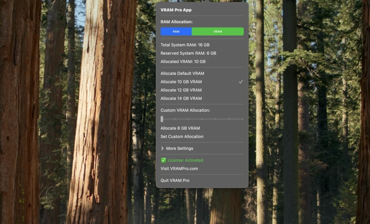 VRAM Pro is an application that allows you to configure the amount of video memory (VRAM).