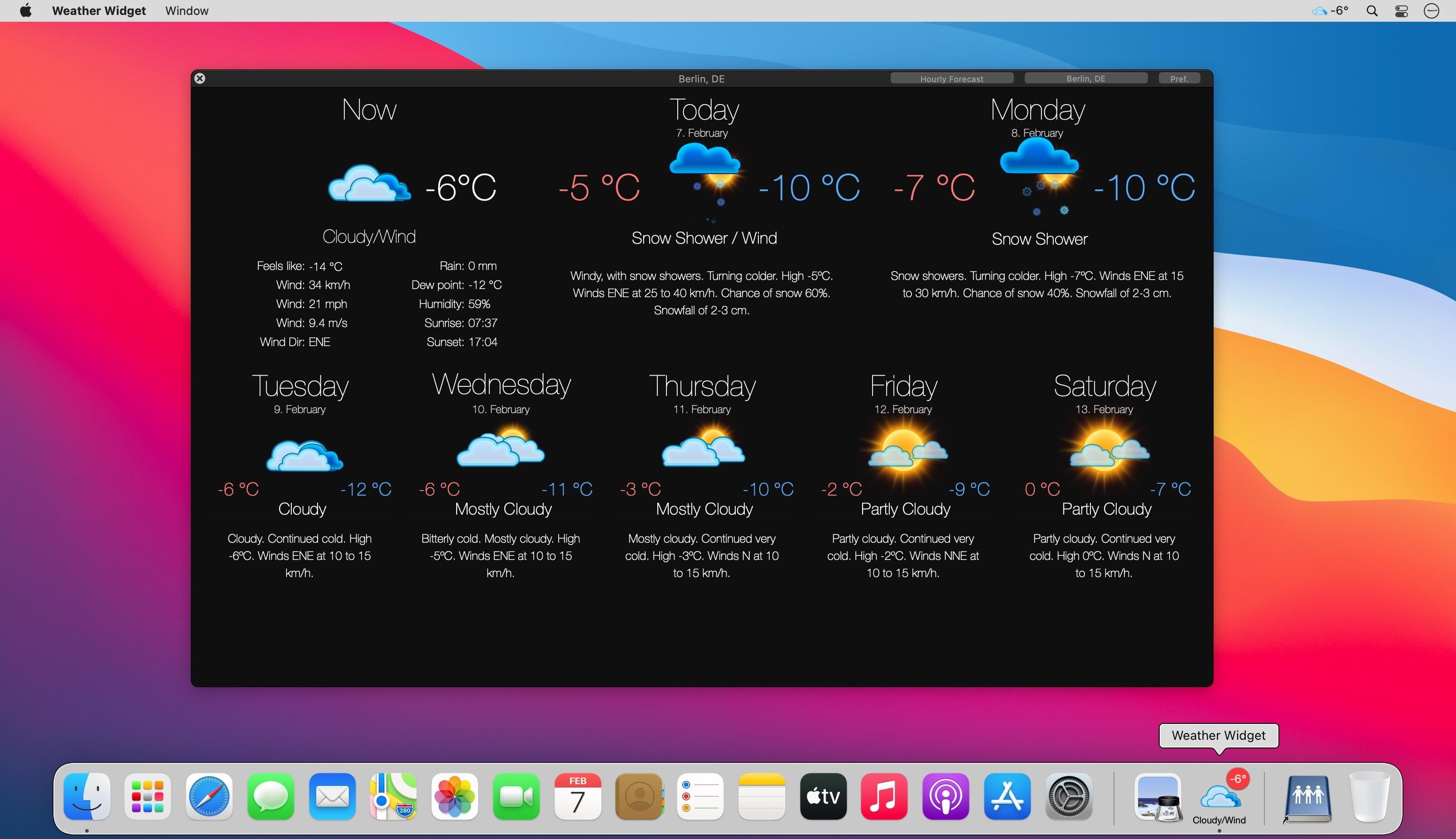 The Weather Widget app icon also gives you a brief forecast or overview of current conditions in both the Dock and the menu bar.