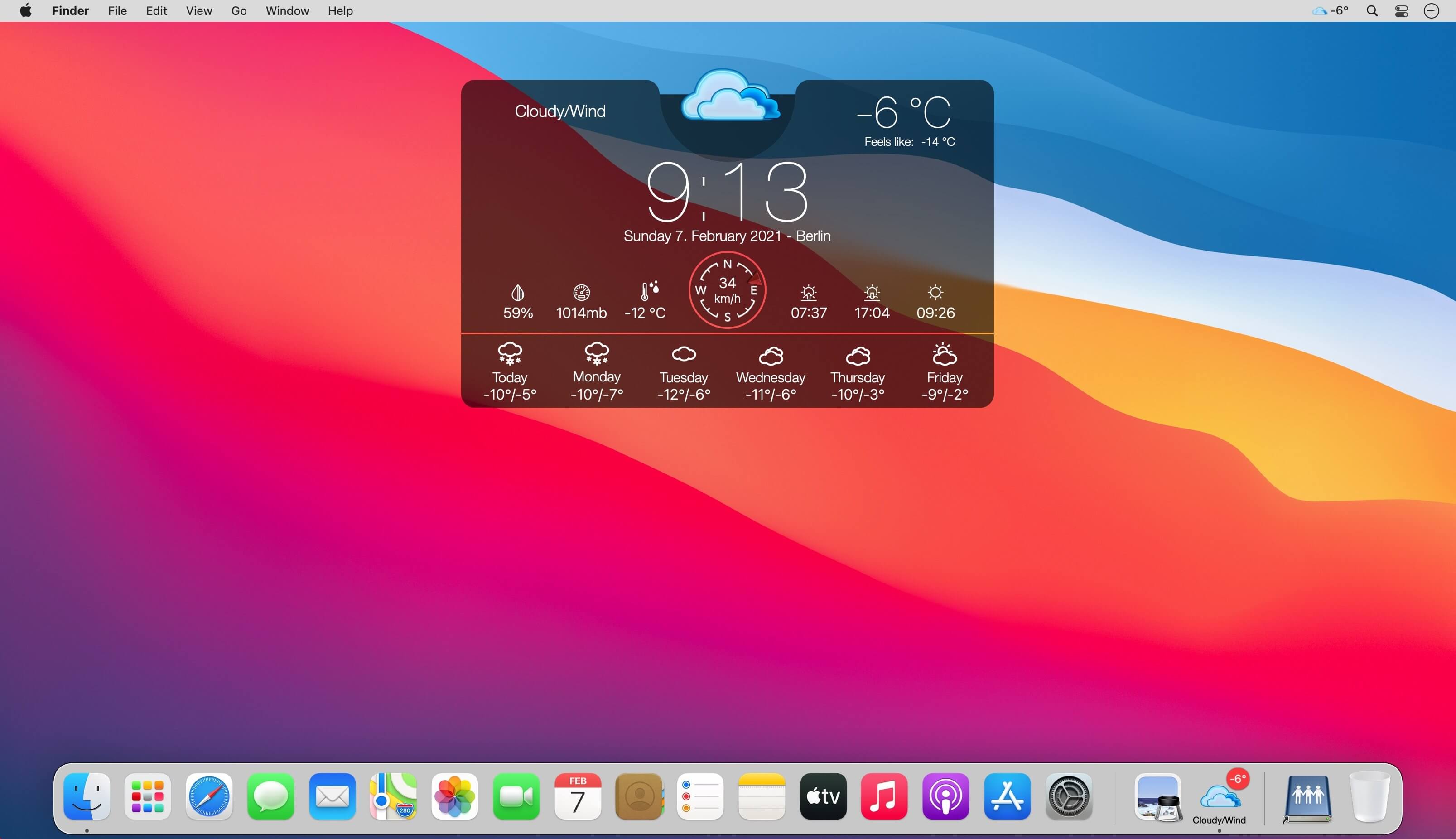 The Weather Widget app icon also gives you a brief forecast or overview of current conditions in both the Dock and the menu bar.